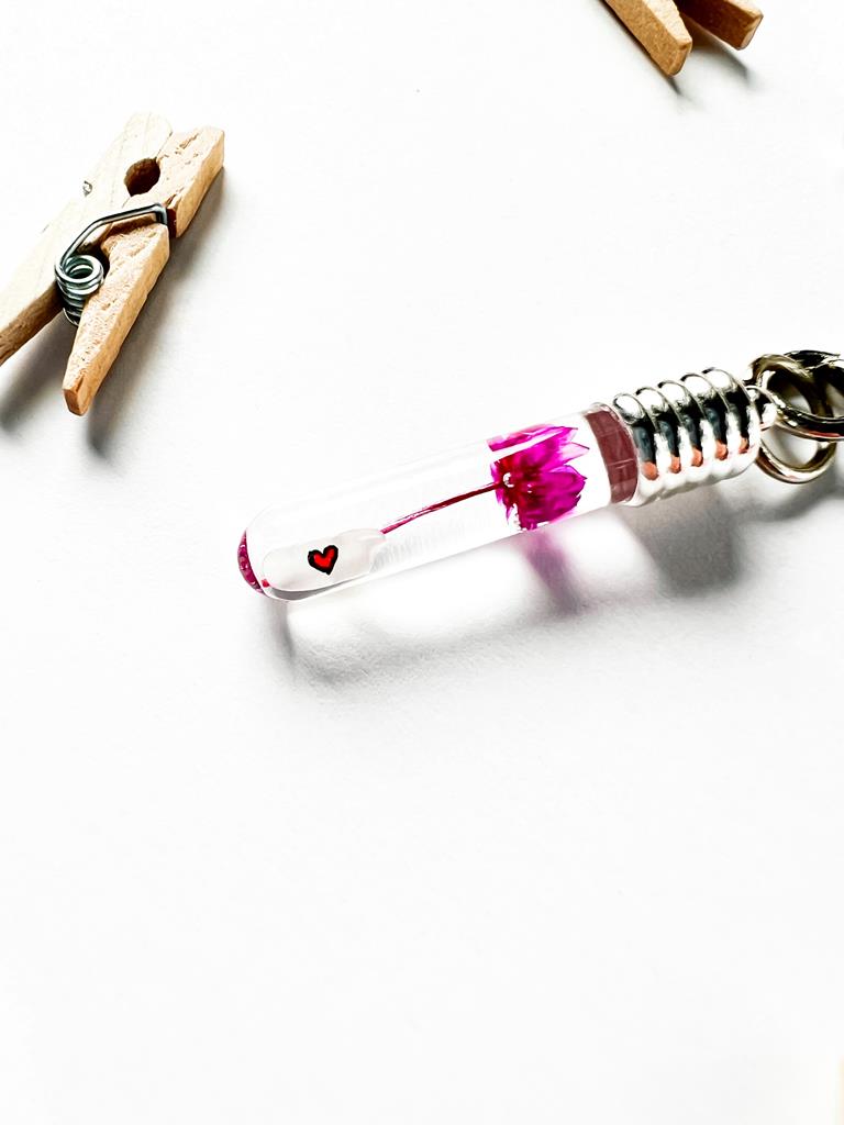 Breloczek z napisem na ziarenku ryżu i szuszonym kwiatkiem.