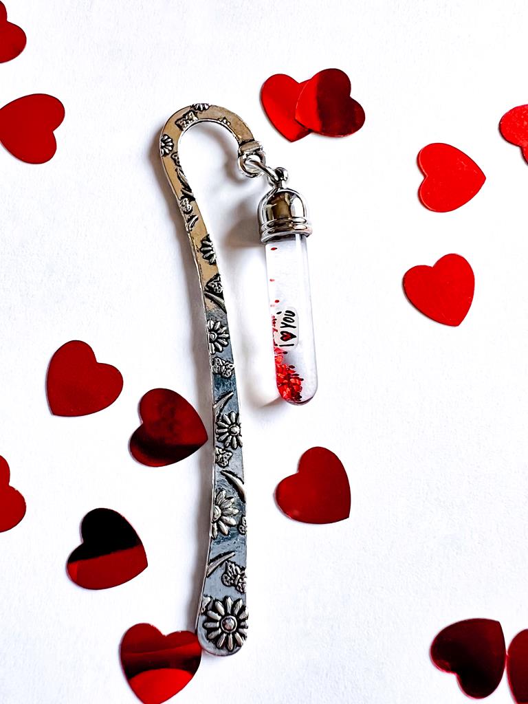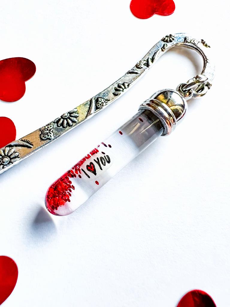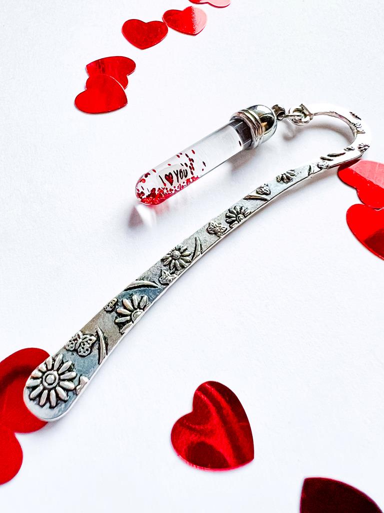 Zakładka z brokatem w kolorze czerwieni i napisem „I ❤️ YOU” świetnie sprawdzi się jako upominek dla osoby lubiącej książki lub piękne przedmioty, której chcemy powiedzieć o swojej miłości.
